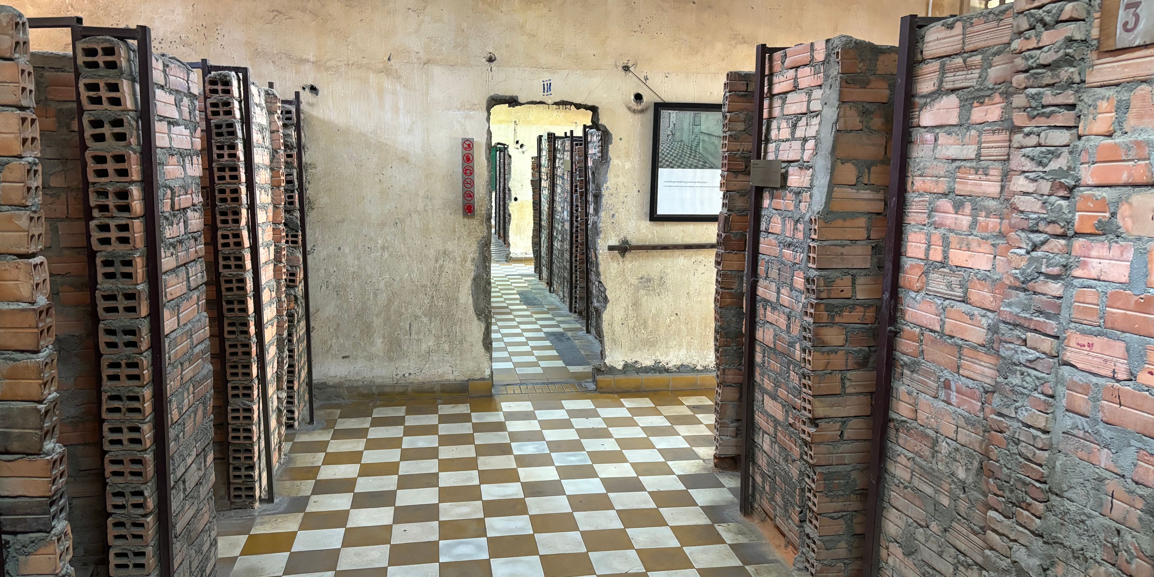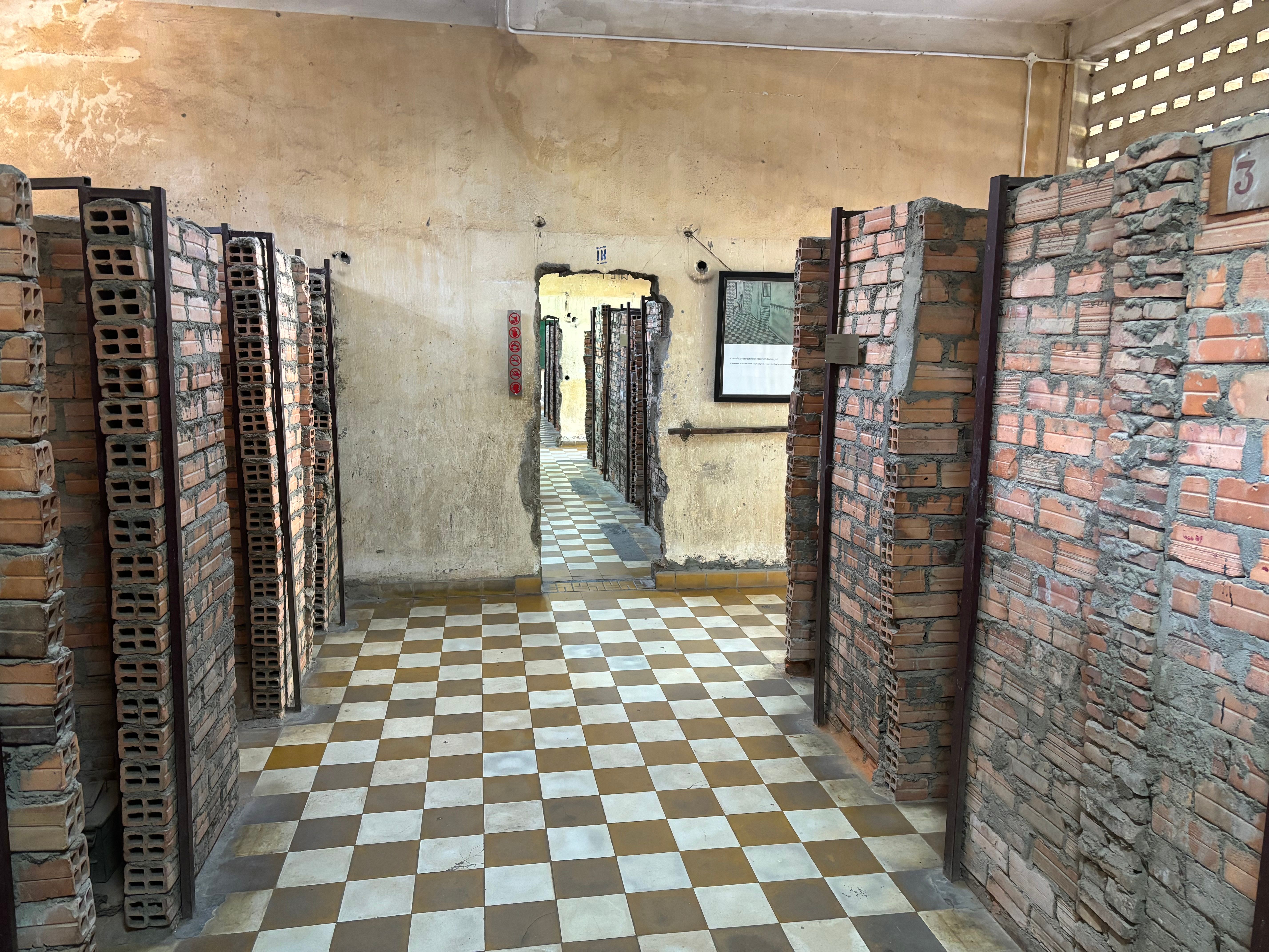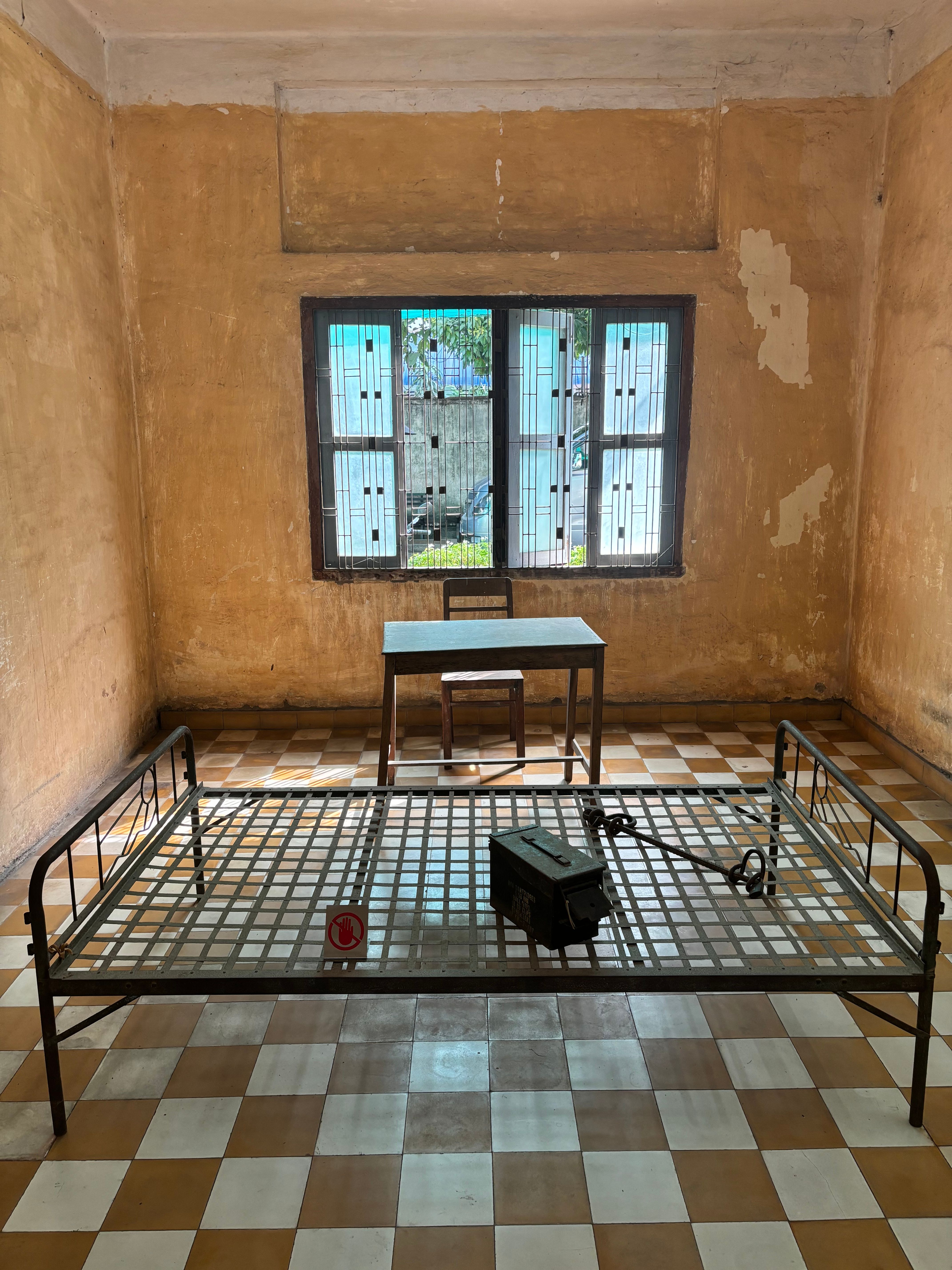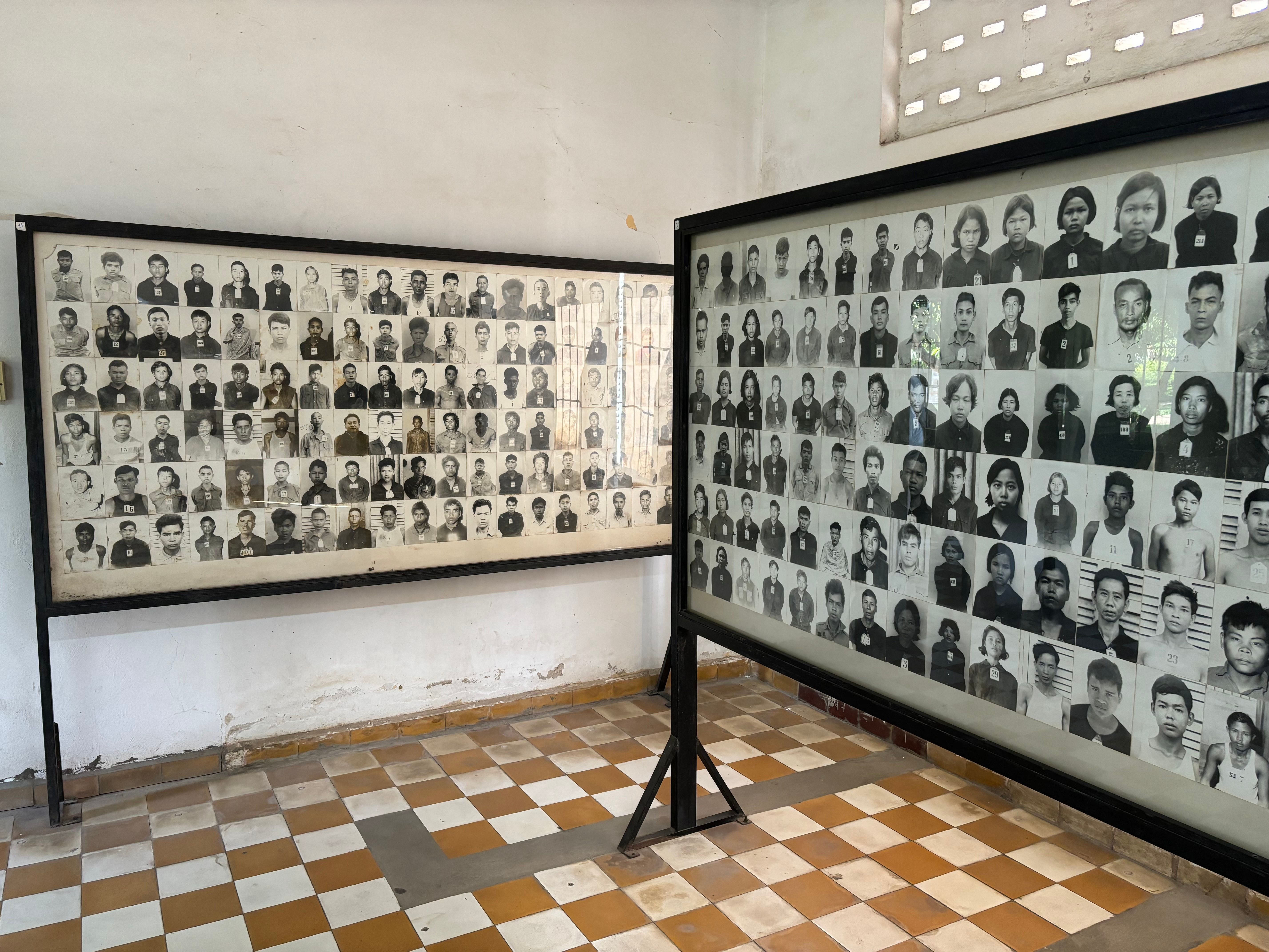 Our last stop in the capital was the S-21 prison complex. It's a place of horrible history. It used to be a school before the Khmer rouge, but then got transformed into a prison and torture center. During the Khmer rouge, the government got overthrown and a communist dictator, Pol Pot was ruling the country. His goal was to create the perfect communist country. His way of achieving it was to eliminate all educated people and anyone who opposed him. During his rule of almost 4 years more than 25% of Cambodians were murdered. The S-21 prison was one of countless locations where people were forced to confess to fictional crimes and eventually killed for them. When they were asking what they did wrong and why they got arrested, the most common reason was: "The act of getting arrested is in itself already proof of being guilty".
