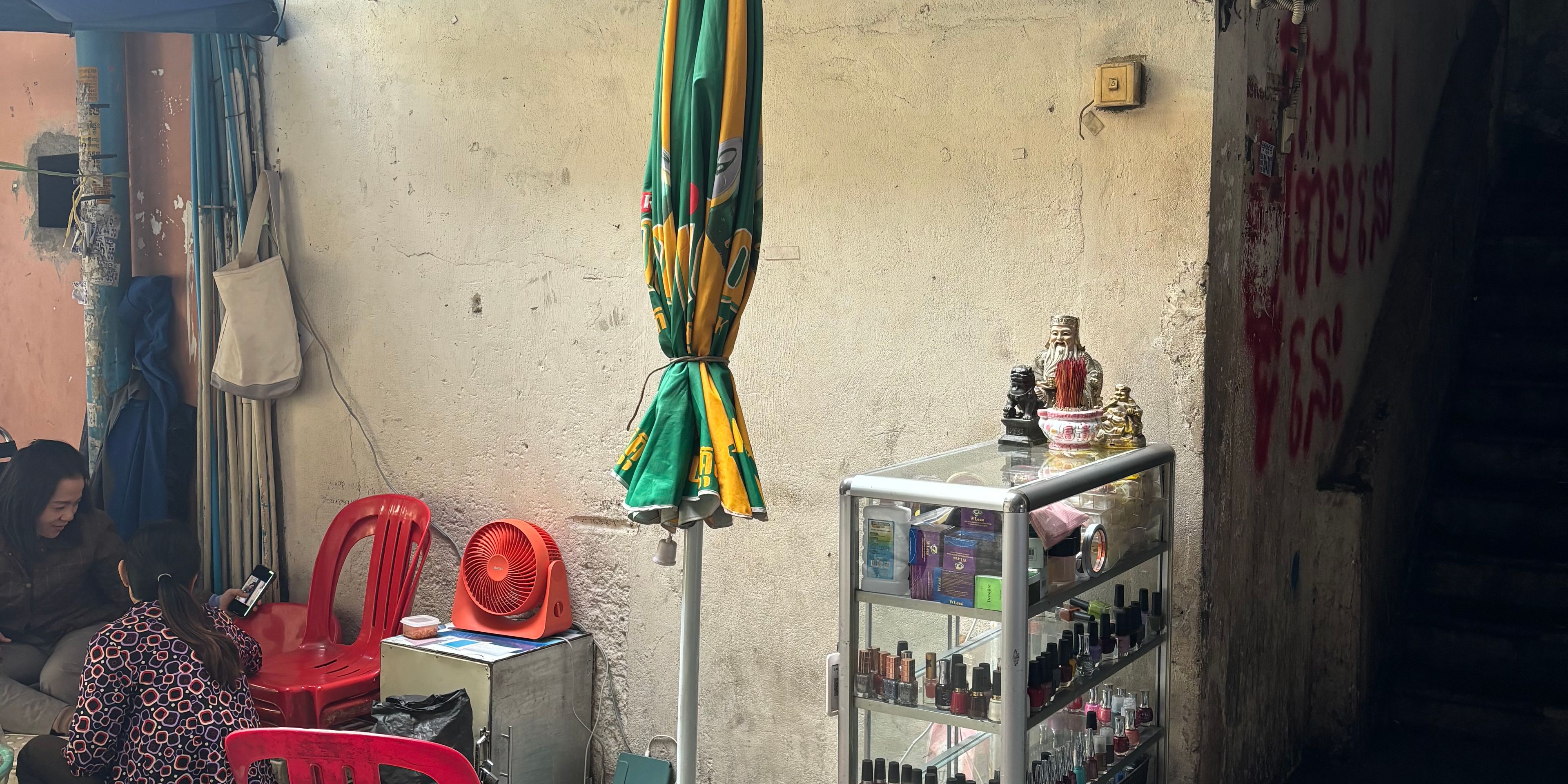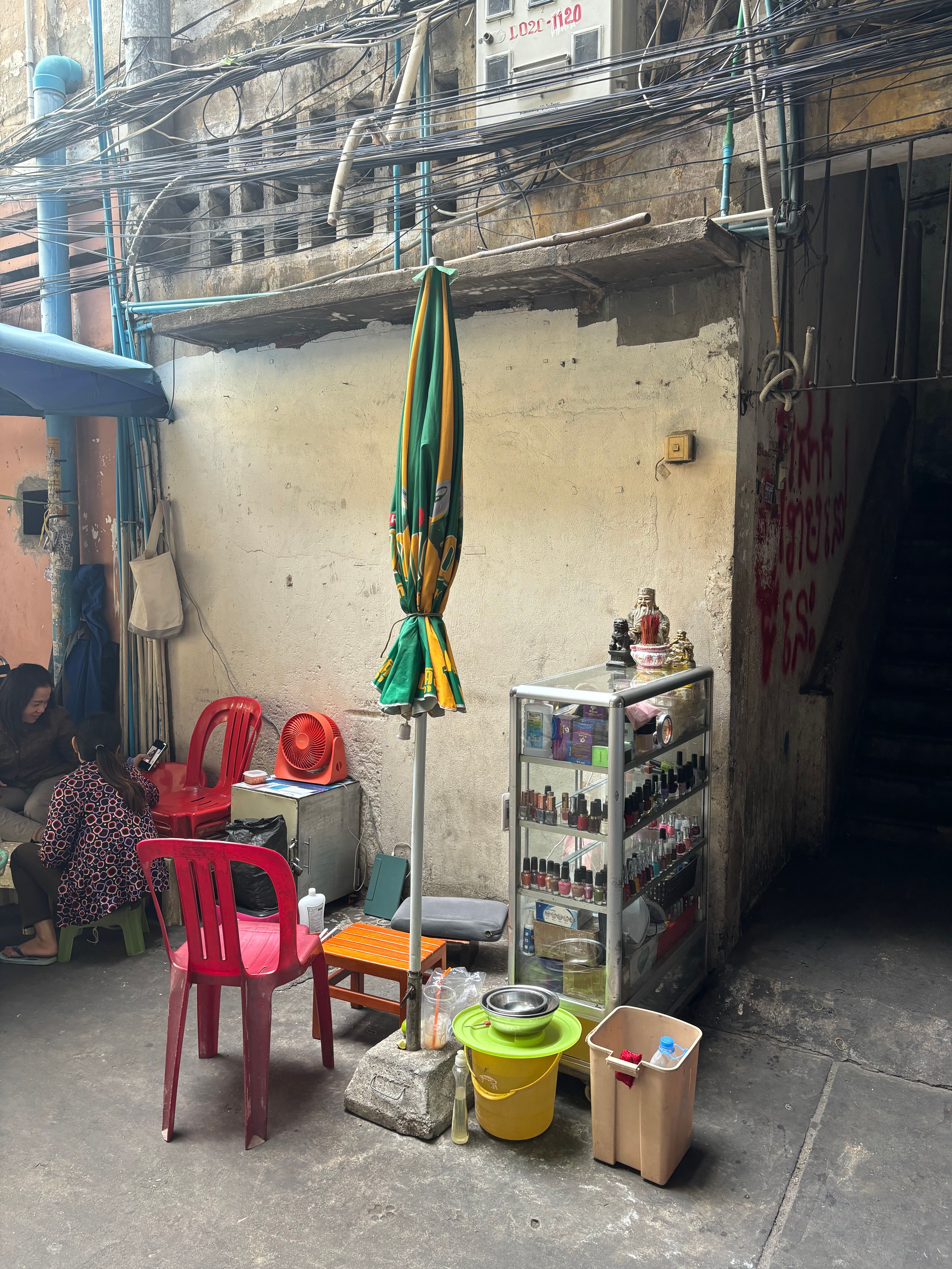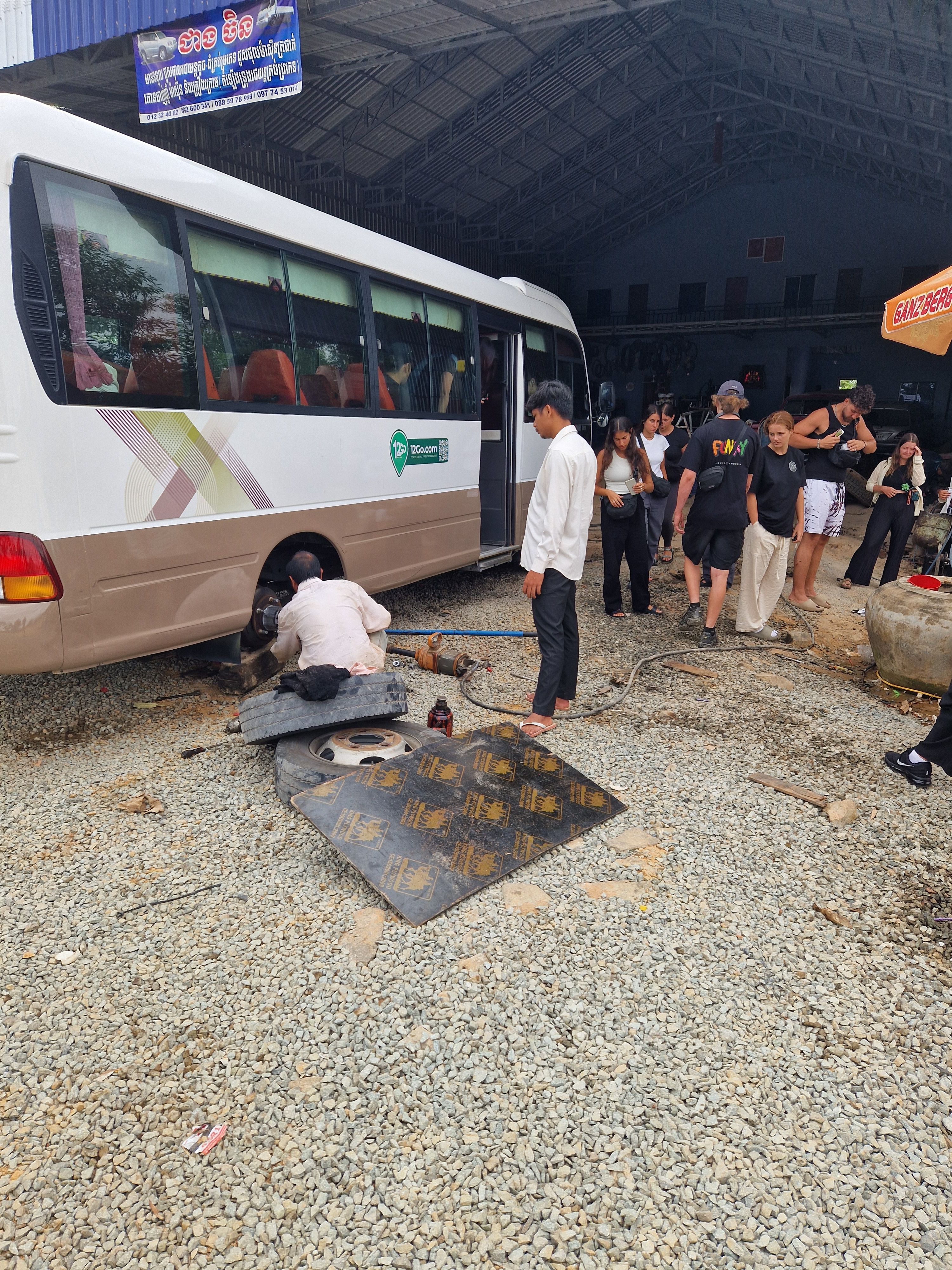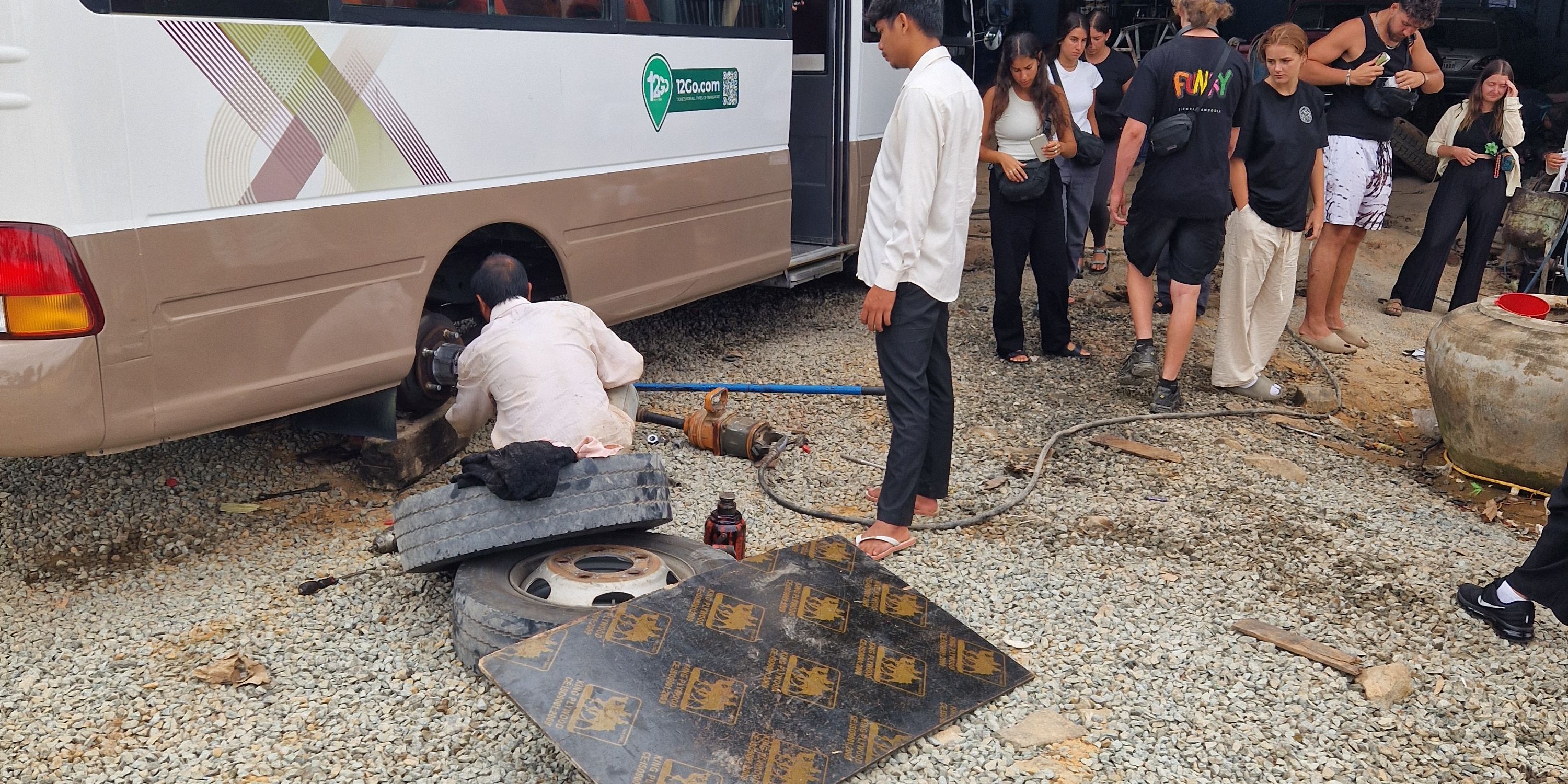 After our temple adventures we took some time for resting (early wakeup) and planning before dinner and bedtime. The next morning it was time to head to the final country of the trip, Thailand. As a final goodbye from Cambodia, one of the wheels of our bus started smelling burnt, so we stopped at a roadside car mechanic store where we spent around 45 minutes until they managed to get it fixed. Even here we saw some hammocks hanging around.