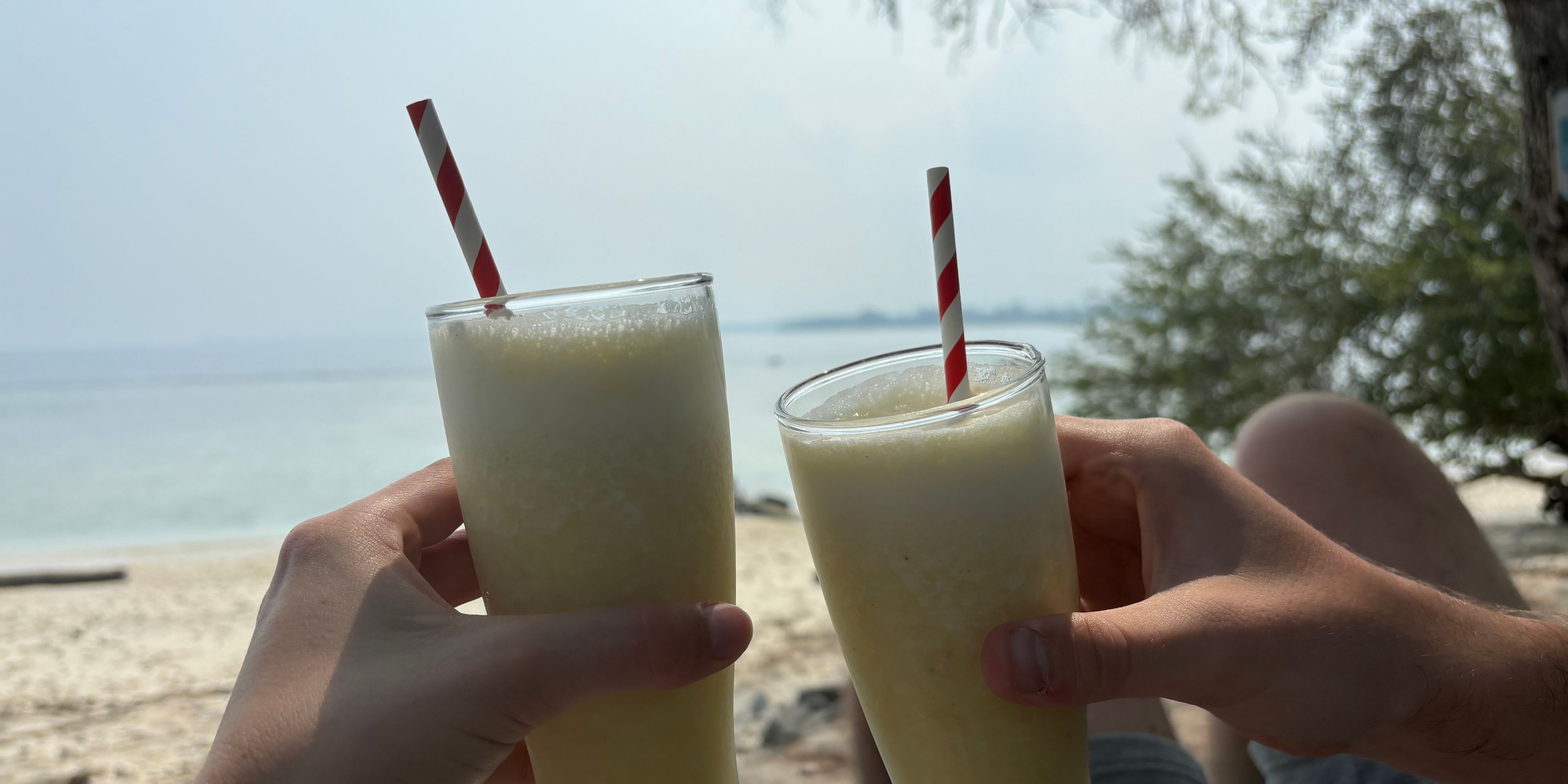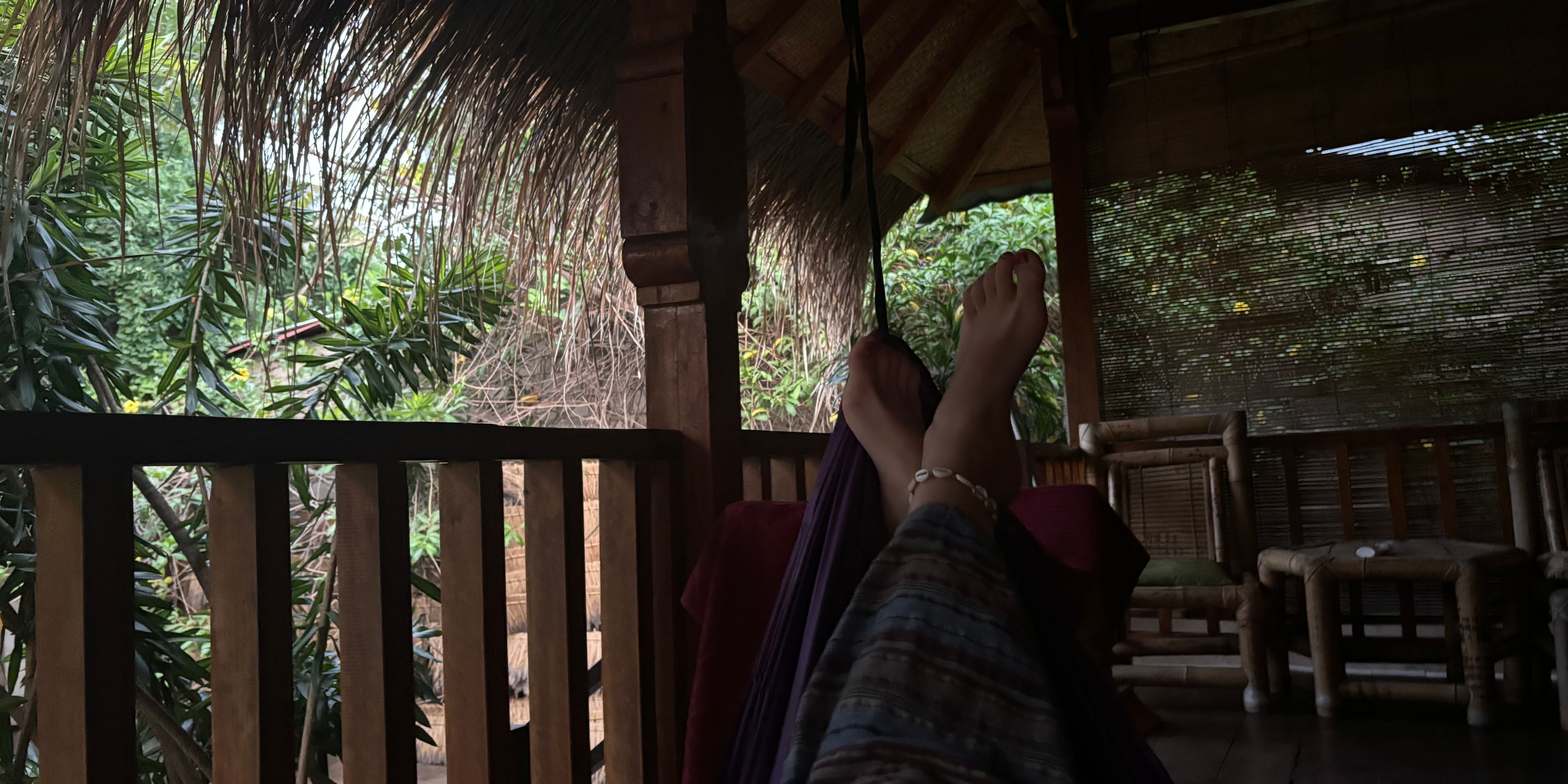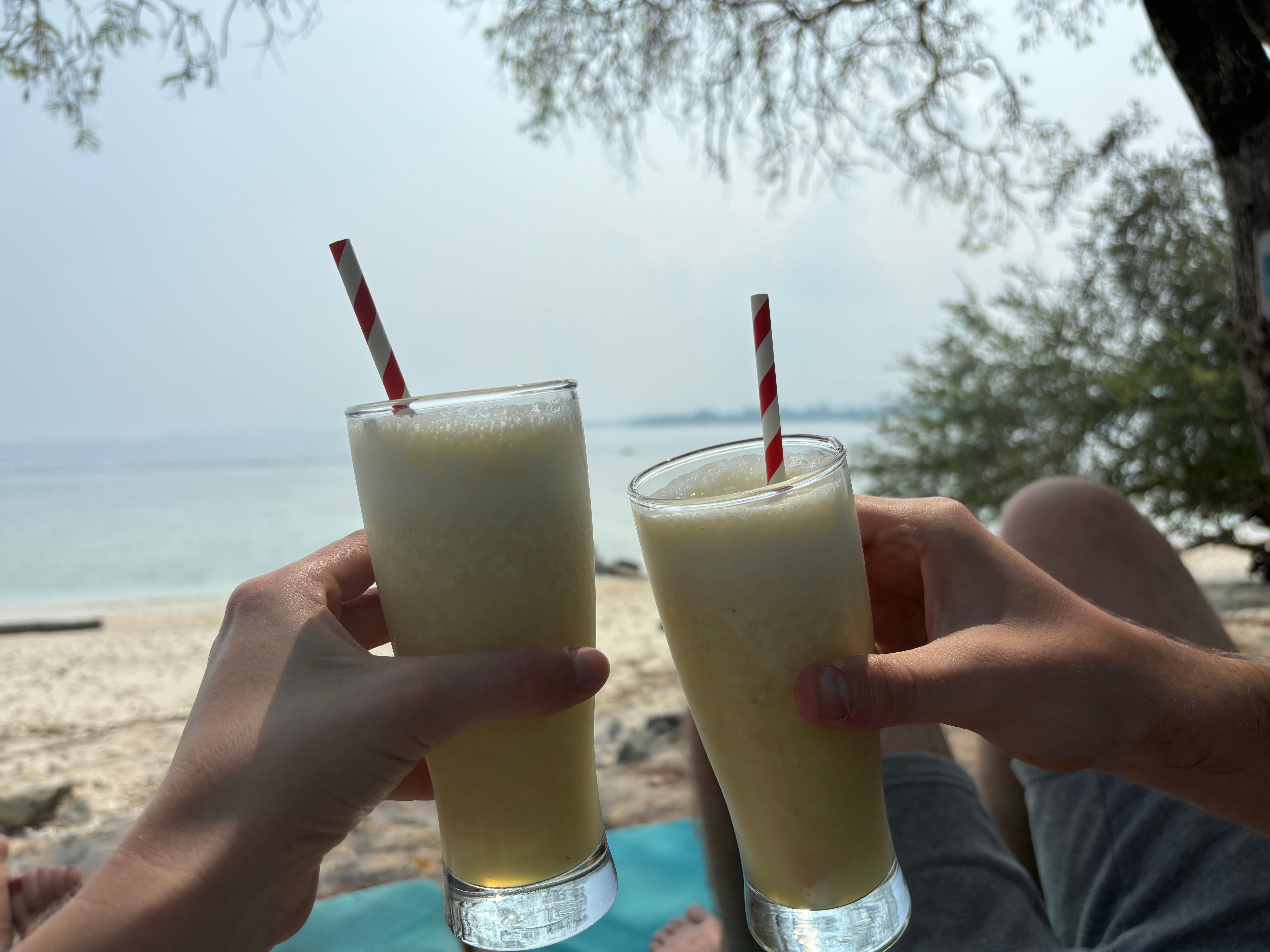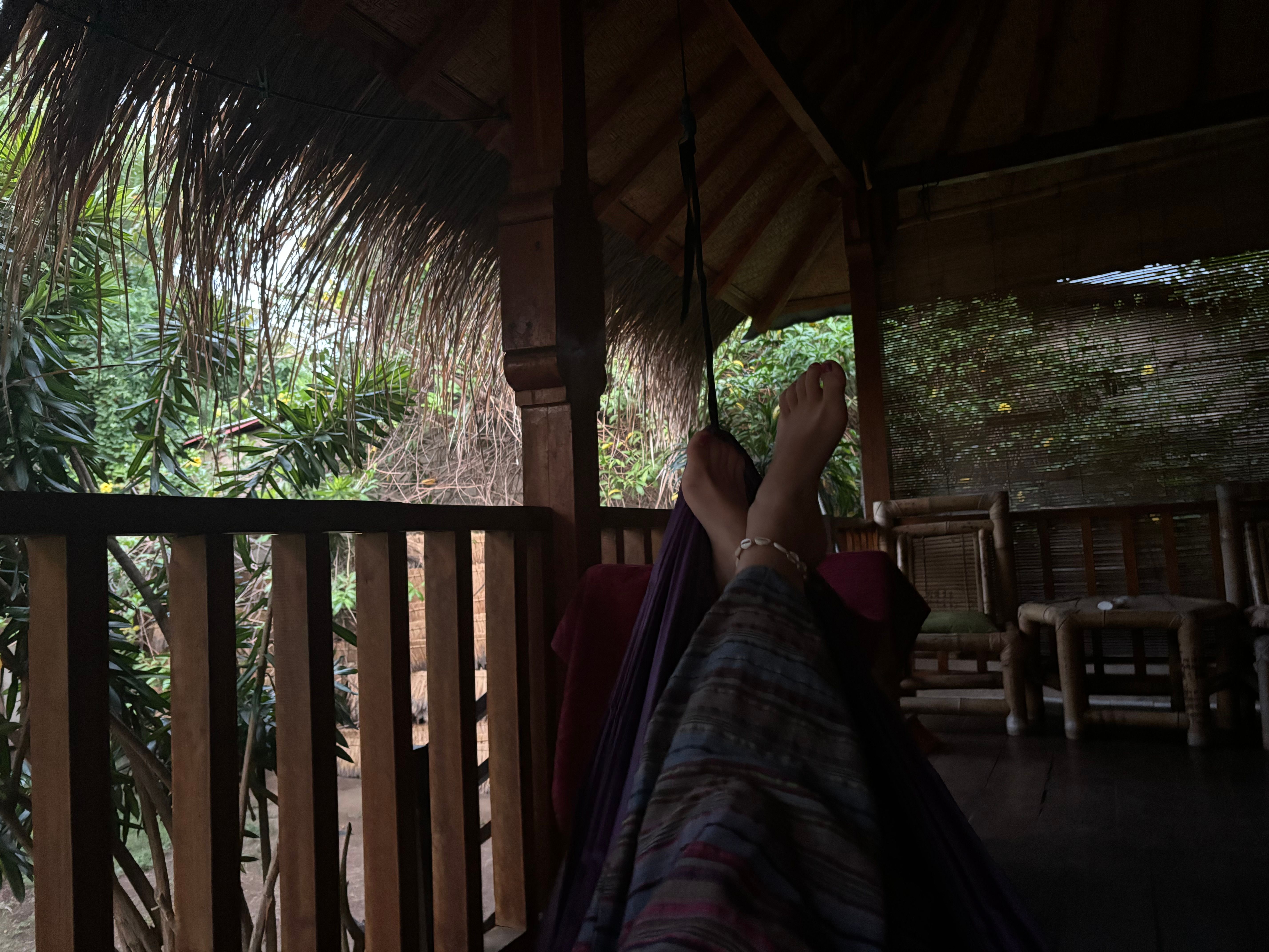 Our accommodation was a humble homestay-style bungalow, including a little terrace and a hammock. Due to the up-and-coming infrastructure on the island, the tap water (including shower) was slightly salty, and in general the level of development felt quite a bit lower than that of Bali. The bathroom was not completely sealed (there was a small uncovered spot in the mosquito net), which allowed an uninvited cockroach to make its way into our lives in the middle of the night. Luckily we managed to get it inside a glass, and didn't have any more visitors of its kind during our stay.