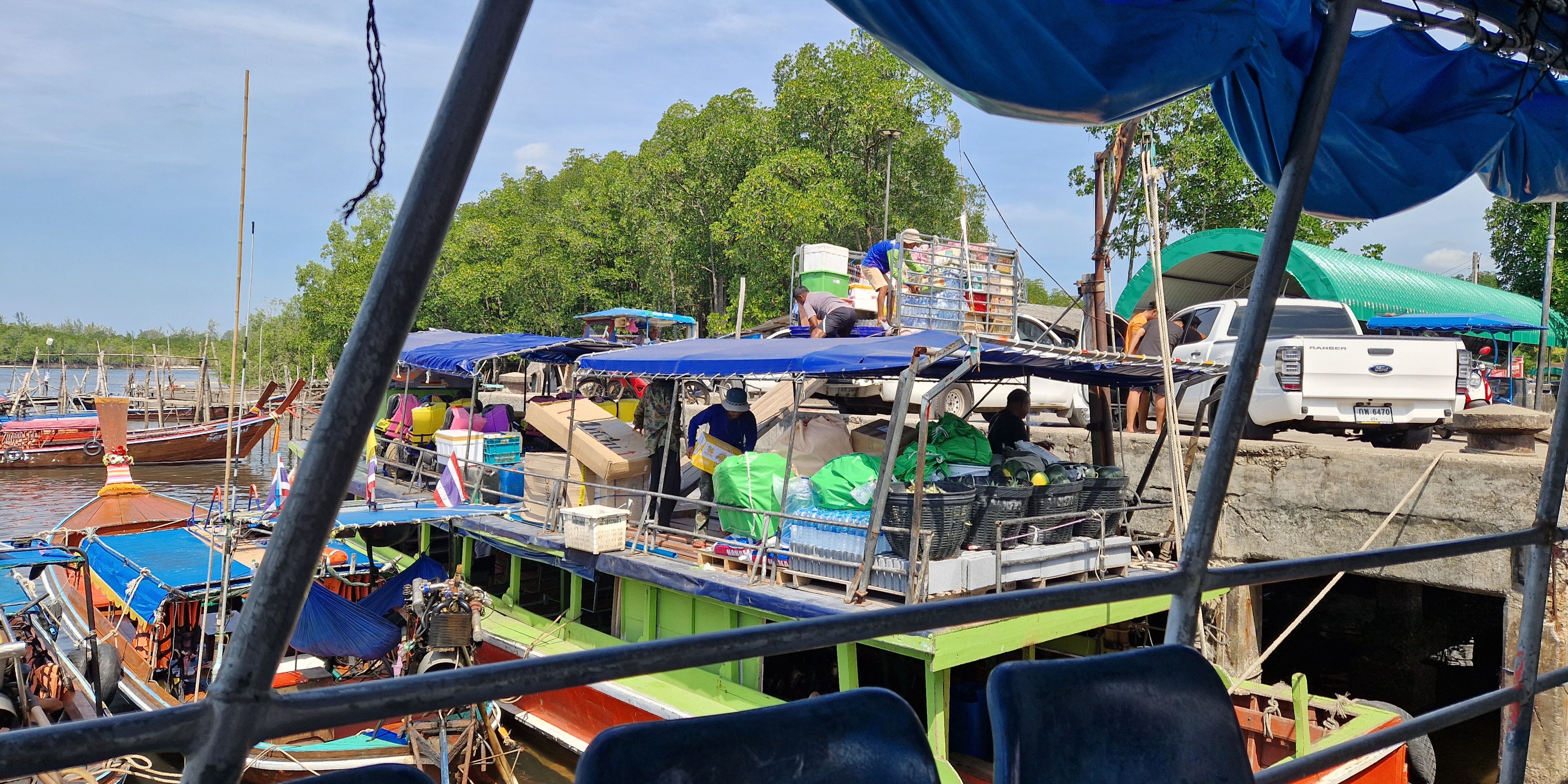 After our adventures in Northern Thailand we landed in the southern town of Trang, from where we continued the journey to the first island of many, Koh Mook (or Ko Muk). Trang is a simple town with not much worth mentioning except a few fruit stalls packed to the rim with watermelons. The ride to the boat was an experience in itself. We traveled to the harbor in a minivan and at some point it got completely filled with stuff, so much so that we had a feeling it might fall on our heads if the ride is too bumpy. Felt strange to be carrying so much stufff, what were they smuggling...?