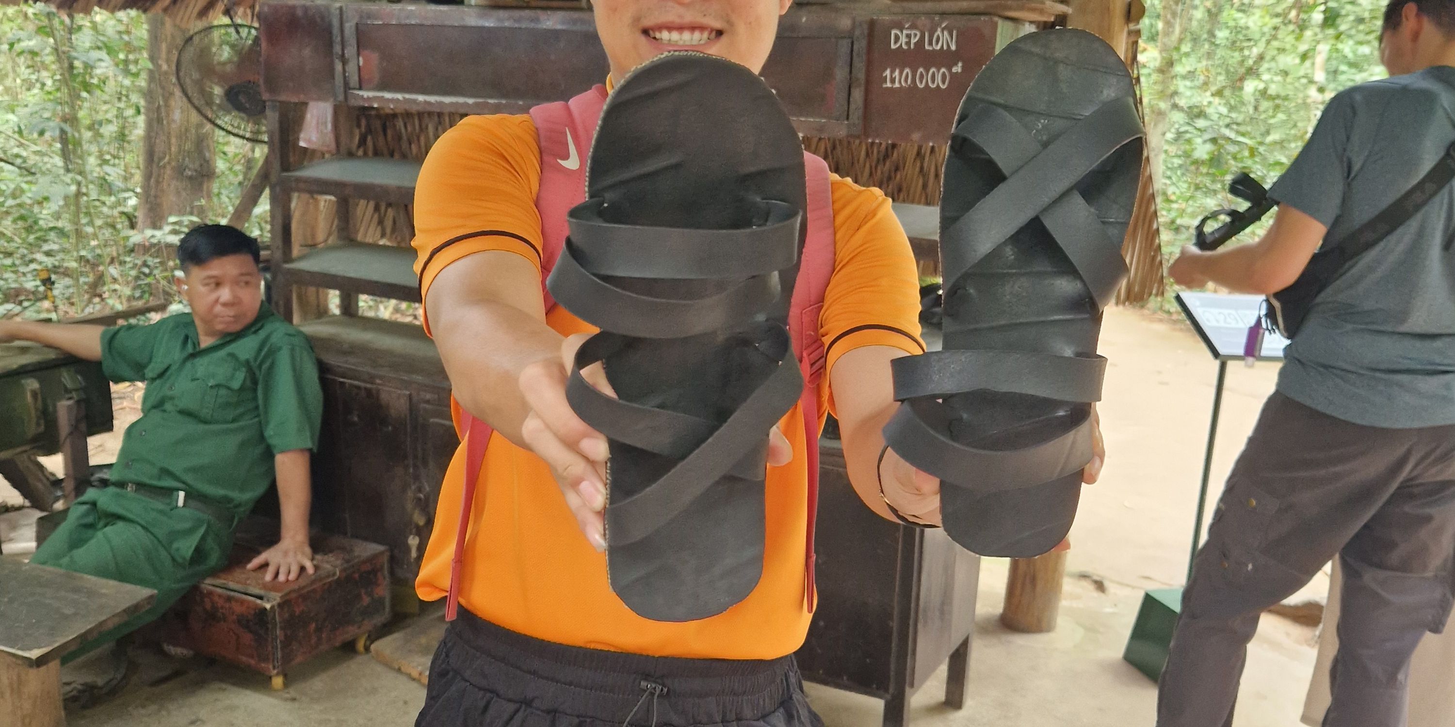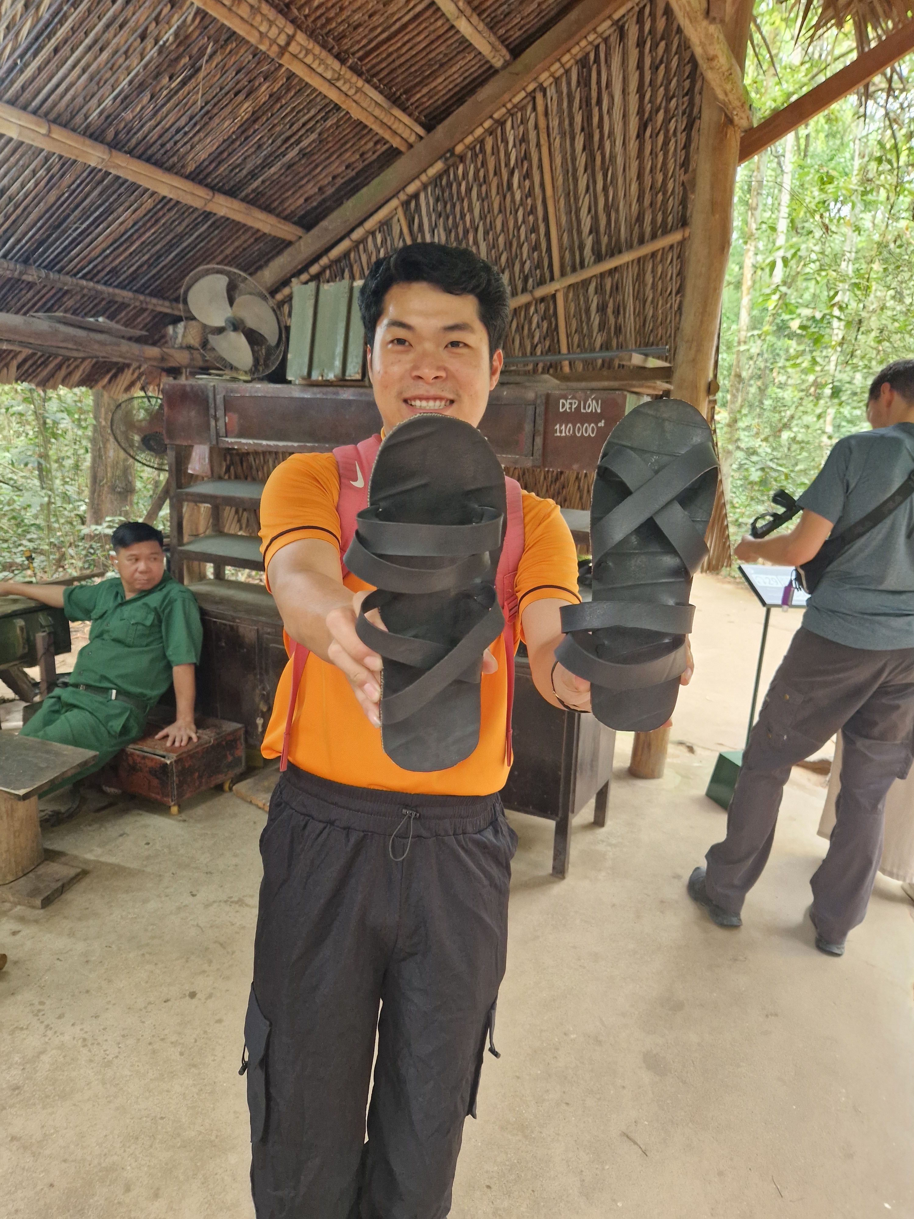The Cu Chi tunnels are a famous destination due to the extensive tunnel system the Viet Cong (the communist rebel army in South Vietnam) built underground during the war to escape from and fight back against the Americans. The jungle was filled with replicas of various kinds of traps, hiding holes and bomb craters. The creativity and resourcefulness of the Vietnamese people is truly impressive. For instance: using the rubber from the tires of defeated American vehicles to craft sandals, that they wore backwards, to misdirect the enemy about their movements. Of course sometimes they would wear them correctly to cause even more confusion.
